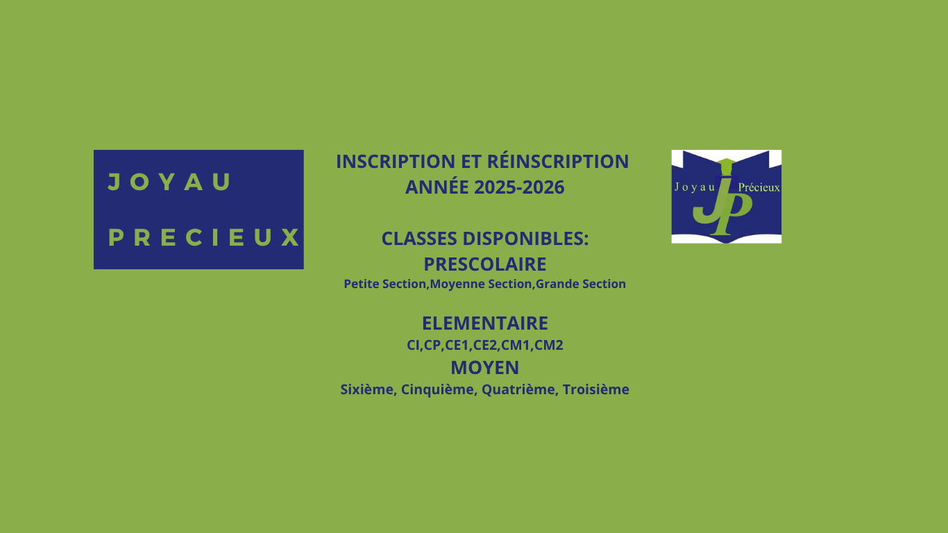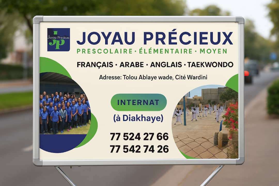 Joyau Précieux est un groupe scolaire qui regroupe le préscolaire, l'elementaire et le moyen. Nous sommes à Keur Massar, tolou Ablaye Wade. Nous dispensons les cours de français selon le curriculum du Ministère de l'Education, des cours d'anglais, d'arabe et de taekwondo.